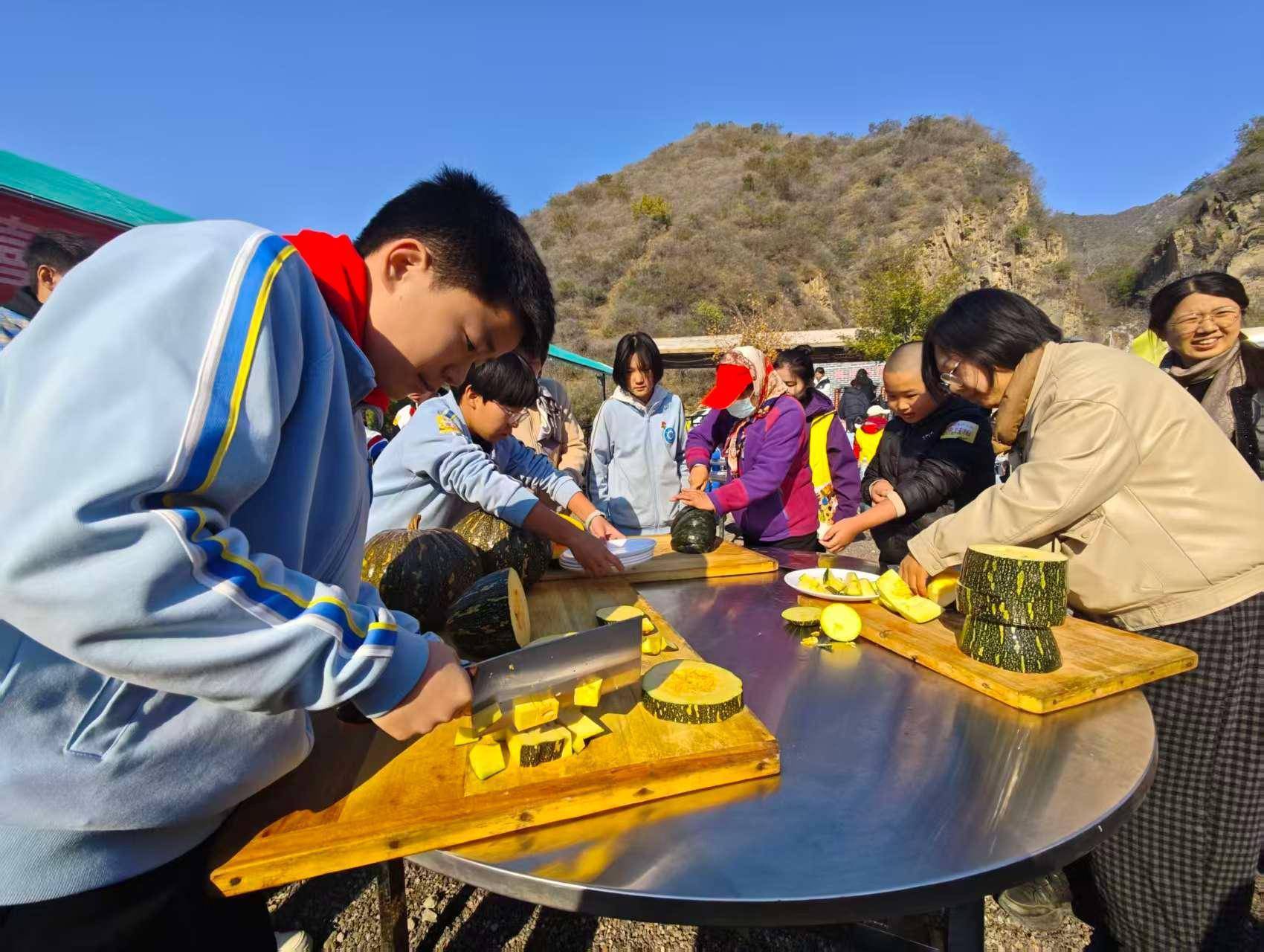 活动中,十支“生产小队”分工协作,投入秋收实践。学生们在白薯田里挥锹翻土、采摘茶菊,在烹饪区洗菜、掌勺、摆盘,一道道由秋收食材制作的菜品相继出炉。不少小队还创新性地加入门头沟本地蜂蜜,为传统菜品增添新风味。